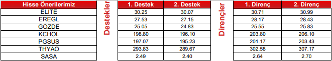 Endeks, dün gerçekleşen işlemlerde 300,46 puan düşüşle 13,407 puan seviyesinden kapanış gerçekleştirdi. Endeksin 13,600 direnç seviyesine doğru olası yükselişlerde kar satışı denenebilir. Gün içi ilk direnç noktası 13,500 puan seviyesidir. Sonraki direnç noktası ise 13,600 puan seviyesidir. Gün içi ilk destek noktası 13,350 puan seviyesidir. Sonraki destek noktası 13,200 puan seviyesidir. Teknik öneri listemize GOZDE’yi ekliyoruz.