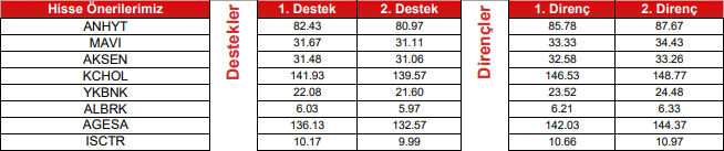 Endeks, dün gerçekleşen işlemlerde 125,59 puan düşüşle 9,306 puan seviyesinden kapanış gerçekleştirdi. Endeksin 9,410 direnç seviyesi altında düşüş eğilimi sürebilir. Gün içi ilk direnç noktası 9,410 puan seviyesidir. Sonraki direnç noktası ise 9,530 puan seviyesidir. Gün içi ilk destek noktası 9,200 puan seviyesidir. Sonraki destek noktası 9,100 puan seviyesidir.