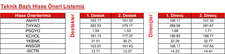 Endeks, dün gerçekleşen işlemlerde 130,79 puan yükselişle 9,961 puan seviyesinden kapanış gerçekleştirdi. Endeksin 9,945 destek seviyesi üzerinde yükseliş eğilimi korunabilir. Gün içi ilk direnç noktası 10,060 puan seviyesidir. Sonraki direnç noktası ise 10,200 puan seviyesidir. Gün içi ilk destek noktası 9,945 puan seviyesidir. Sonraki destek noktası 9,850 puan seviyesidir.