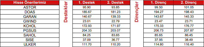 Endeks, dün gerçekleşen işlemlerde 7,02 puan yükselişle 11,123 puan seviyesinden kapanış gerçekleştirdi. Endeksin 11,000 destek seviyesi üzerinde yükseliş eğilimi korunabilir. Gün içi ilk direnç noktası 11,200 puan seviyesidir. Sonraki direnç noktası ise 11,300 puan seviyesidir. Gün içi ilk destek noktası 11,060 puan seviyesidir. Sonraki destek noktası 10,950 puan seviyesidir.