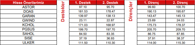 Endeks, dün gerçekleşen işlemlerde 86,65 puan düşüşle 11,036 puan seviyesinden kapanış gerçekleştirdi. Endeksin 10,950 destek seviyesi üzerinde yükseliş eğilimi korunabilir. Gün içi ilk direnç noktası 11,200 puan seviyesidir. Sonraki direnç noktası ise 11,300 puan seviyesidir. Gün içi ilk destek noktası 10,950 puan seviyesidir. Sonraki destek noktası 10,860 puan seviyesidir.