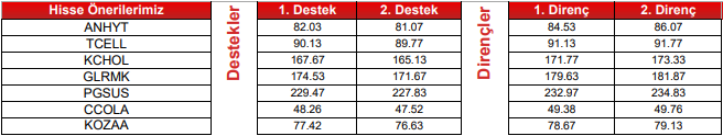 Endeks, dün gerçekleşen işlemlerde 91,25 puan yükselişle 10,828 puan seviyesinden kapanış gerçekleştirdi. Endeksin 11,100 puan direnç seviyesine doğru olası yükselişlerde satış denenebilir. Gün içi ilk direnç noktası 10,980 puan seviyesidir. Sonraki direnç noktası ise 11,100 puan seviyesidir. Gün içi ilk destek noktası 10,740 puan seviyesidir. Sonraki destek noktası 10,620 puan seviyesidir.