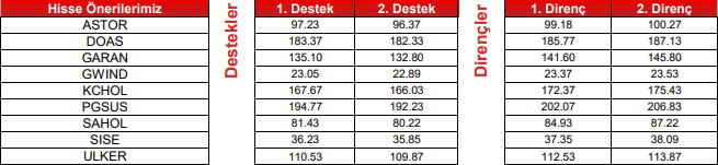 Endeks, dün gerçekleşen işlemlerde 118,31 puan düşüşle 10,918 puan seviyesinden kapanış gerçekleştirdi. Endeksin 20 günlük hareketli ortalamasının bulunduğu 10,850 destek seviyesinde dengelenme beklenebilir. Gün içi ilk direnç noktası 11,025 puan seviyesidir. Sonraki direnç noktası ise 11,125 puan seviyesidir. Gün içi ilk destek noktası 10,850 puan seviyesidir. Sonraki destek noktası 10,800 puan seviyesidir.
