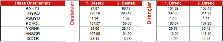 Endeks, dün gerçekleşen işlemlerde 87,30 puan düşüşle 9,719 puan seviyesinden kapanış gerçekleştirdi. Endeksin 9,950 direnç seviyesine doğru tepki yükselişi beklenebilir. Gün içi ilk direnç noktası 9,840 puan seviyesidir. Sonraki direnç noktası ise 9,950 puan seviyesidir. Gün içi ilk destek noktası 9,650 puan seviyesidir. Sonraki destek noktası 9,560 puan seviyesidir.