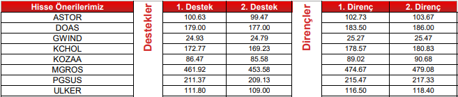Endeks, dün gerçekleşen işlemlerde 102,90 puan yükselişle 11,073 puan seviyesinden kapanış gerçekleştirdi. Endeksin 10,980 destek seviyesi üzerinde yükseliş eğilimi korunabilir. Gün içi ilk direnç noktası 11,160 puan seviyesidir. Sonraki direnç noktası ise 11,270 puan seviyesidir. Gün içi ilk destek noktası 10,980 puan seviyesidir. Sonraki destek noktası 10,800 puan seviyesidir. Teknik öneri listemizden ANHYT, CCOLA ve PATEK’i çıkartıp, ASTOR ve KOZAA’yı ekliyoruz.