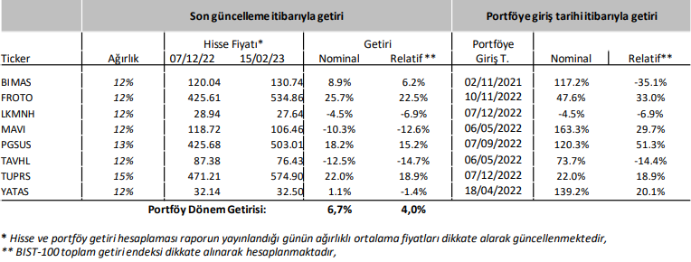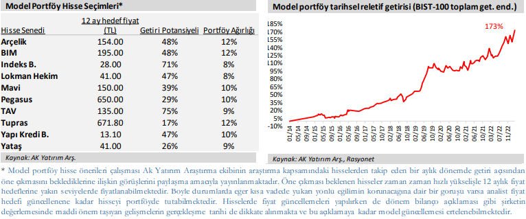 – Model portföyümüzün en son değişiklikleri yaptığımız 7 Aralık tarihinden bu yana getirisi %6,7 olarak gerçekleşti ve aynı dönemde %2,6 değer kazanan BIST-100 toplam getiri endeksini %4,0 geçti. Model portföyümüz 2022 başından itibaren de %5,5 değer kaybetmesine rağmen aynı dönemde %10,1 değer kaybeden BIST-100 toplam getiri endeksine göre daha iyi performans gösterdi. – Bu dönemde Ford Otosan, Tüpraş ve Pegasus endekse belirgin güçlü katkı sağlarken, Mavi, Tav Hava Limanları ve Lokman Hekim bir miktar olumsuz ayrıştı.