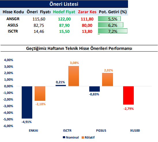 Son işlem haftasında 10 haftalık hareketli ortalamasından destek alarak yükseliş gerçekleştiren ANSGR geçtiğimiz haftayı 107,40 TL seviyesinin üzerinde tamamladı. Hissede bu hafta öncelikli olarak 10 haftalık ortalamanın üzerindeki tutunmaları izleyeceğiz. Bu seviyenin üzerinde kalıcılık sağlanması halinde 119,50 TL seviyesi aşılırsa alımların hız kazanabileceğini düşünüyoruz.