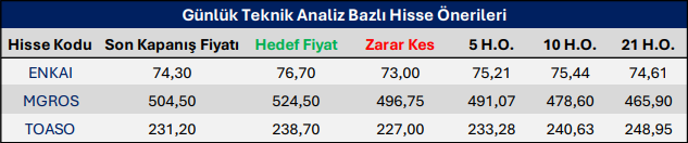 Günlük Teknik Analiz Bazlı Hisse Önerileri