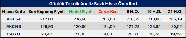 Günlük Teknik Analiz Bazlı Hisse Önerileri