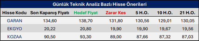 Günlük Teknik Analiz Bazlı Hisse Önerileri