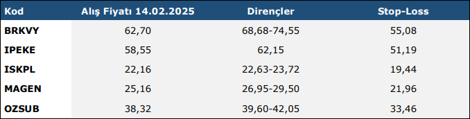 * Haftalık Teknik Takip Listelerinde (“Teknik Liste”) yer alan hisse senetleri, dirençler ve Stop-Loss seviyeleri teknik analiz kriterlerine göre seçilmiştir. Liste içerisinden bireysel hisse senedi seçimi yapılması beklentilerinize uygun sonuçlar doğurmayabilir.
