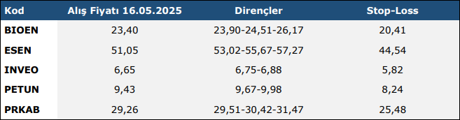* Haftalık Teknik Takip Listelerinde (“Teknik Liste”) yer alan hisse senetleri, dirençler ve Stop-Loss seviyeleri teknik analiz kriterlerine göre seçilmiştir. Liste içerisinden bireysel hisse senedi seçimi yapılması beklentilerinize uygun sonuçlar doğurmayabilir.