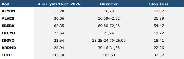 * Haftalık Teknik Takip Listelerinde (“Teknik Liste”) yer alan hisse senetleri, dirençler ve Stop-Loss seviyeleri teknik analiz kriterlerine göre seçilmiştir. Liste içerisinden bireysel hisse senedi seçimi yapılması beklentilerinize uygun sonuçlar doğurmayabilir.