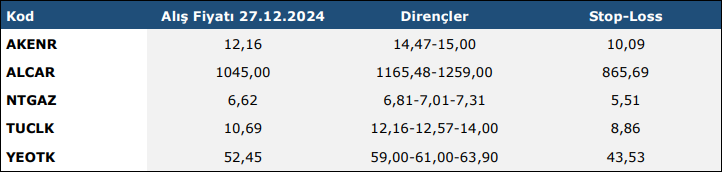 * Haftalık Teknik Takip Listelerinde (“Teknik Liste”) yer alan hisse senetleri, dirençler ve Stop-Loss seviyeleri teknik analiz kriterlerine göre seçilmiştir. Liste içerisinden bireysel hisse senedi seçimi yapılması beklentilerinize uygun sonuçlar doğurmayabilir.
