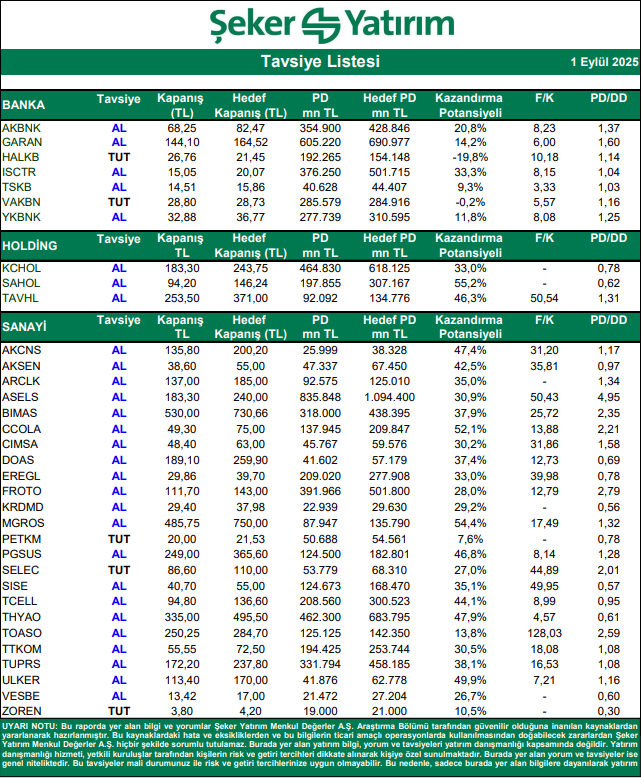 Şeker Yatırım Hisse Tavsiye Listesi – (1.09.2025)