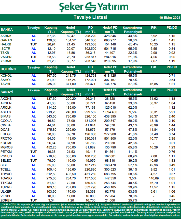 Kaynak: Şeker Yatırım Tavsiye Listesi