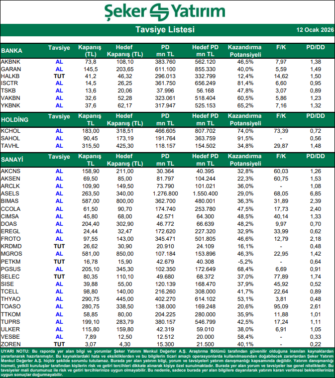 Şeker Yatırım Hisse Tavsiye Listesi – (12.01.2026)