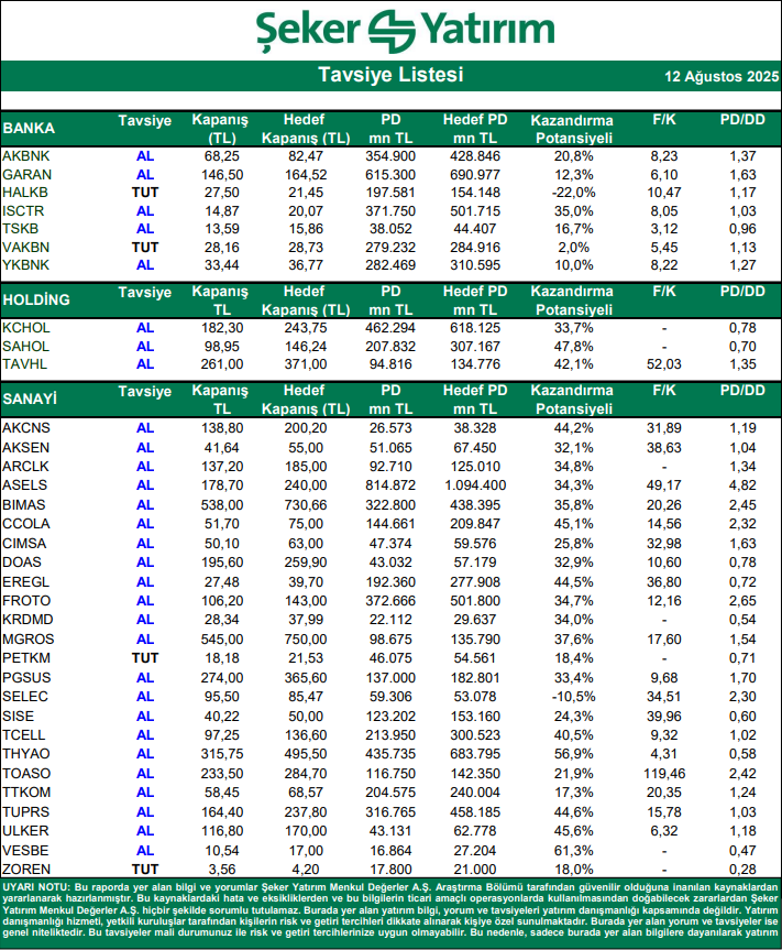 Kaynak: Şeker Yatırım Tavsiye Listesi