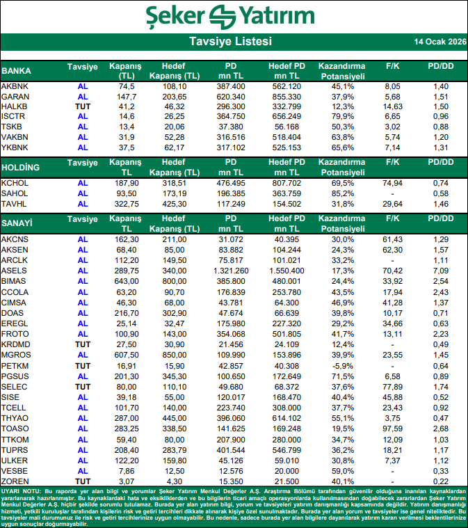Şeker Yatırım Hisse Tavsiye Listesi – (14.01.2026)