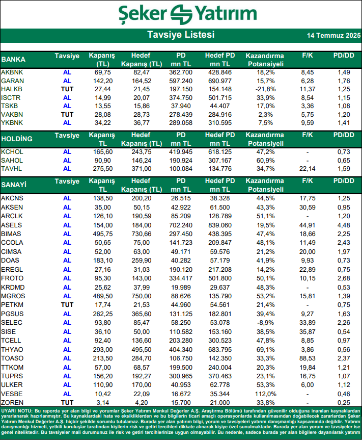 Kaynak: Şeker Yatırım Tavsiye Listesi