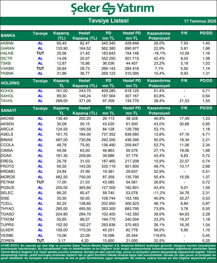 Şeker Yatırım Hisse Tavsiye Listesi – (17.07.2025)