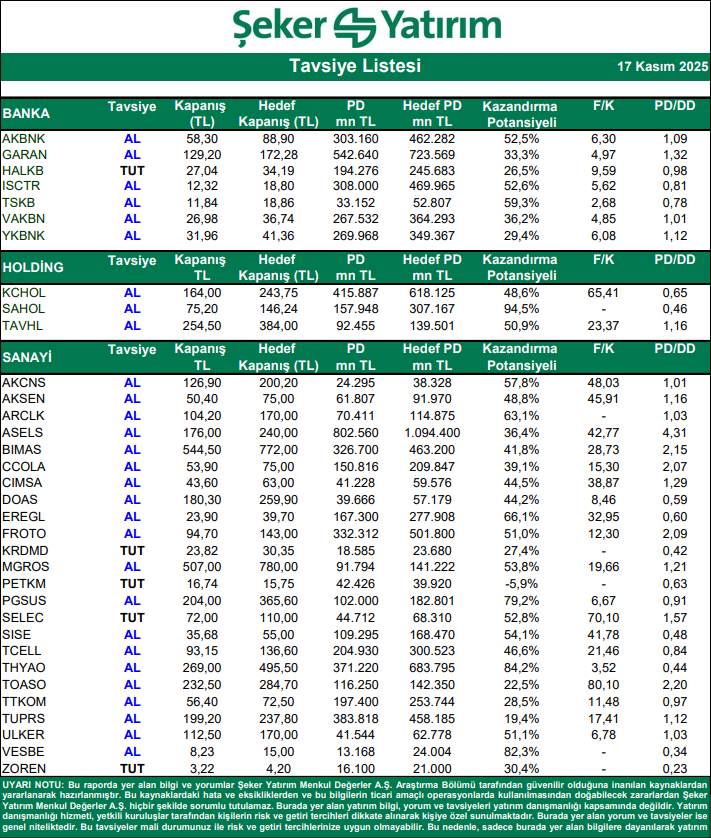 Şeker Yatırım Hisse Tavsiye Listesi – (17.11.2025)