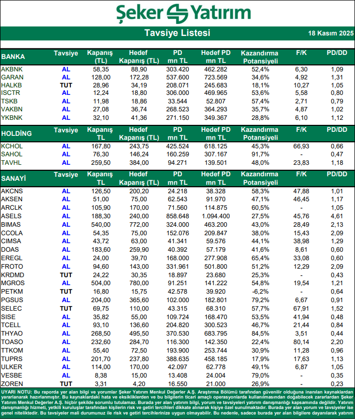 Şeker Yatırım Hisse Tavsiye Listesi – (18.11.2025)