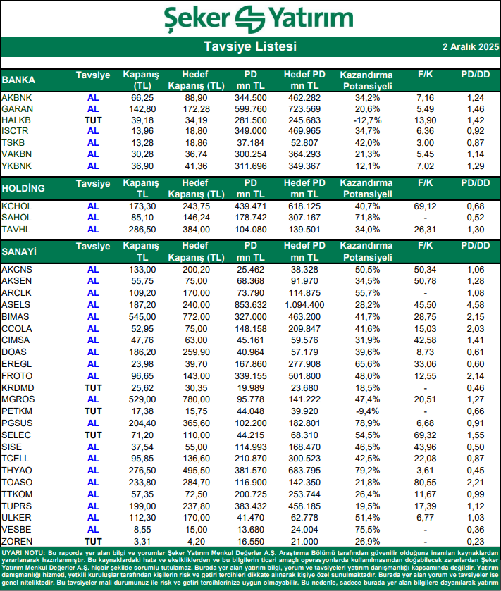 Kaynak: Şeker Yatırım Tavsiye Listesi