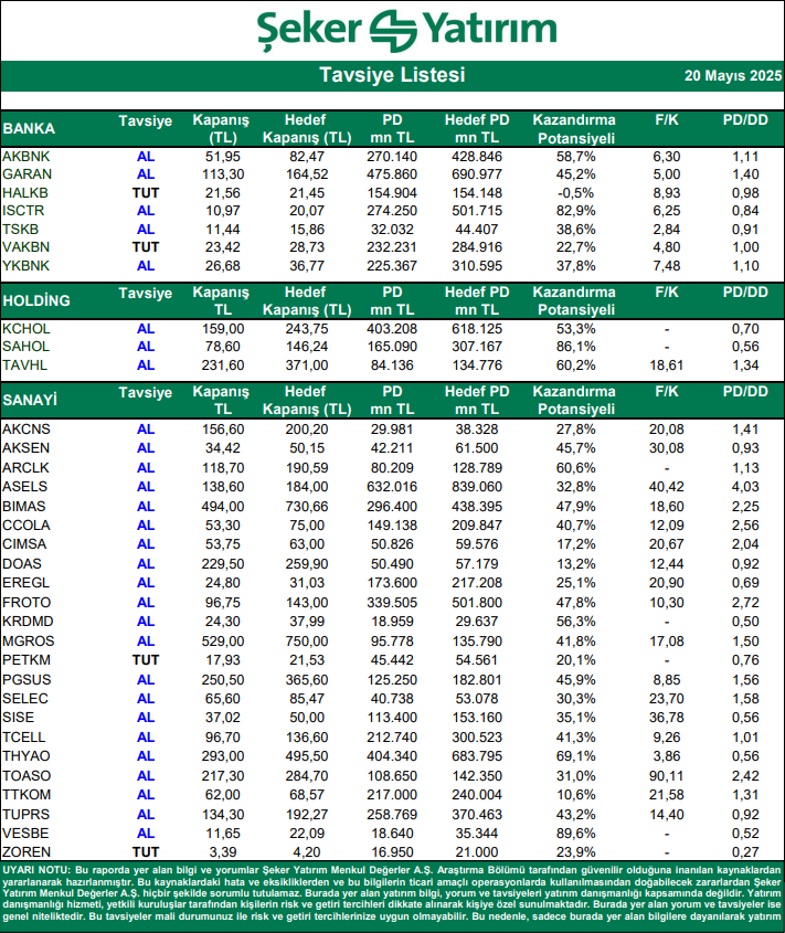 Kaynak: Şeker Yatırım Tavsiye Listesi
