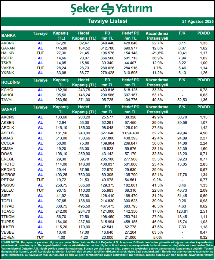 Kaynak: Şeker Yatırım Tavsiye Listesi