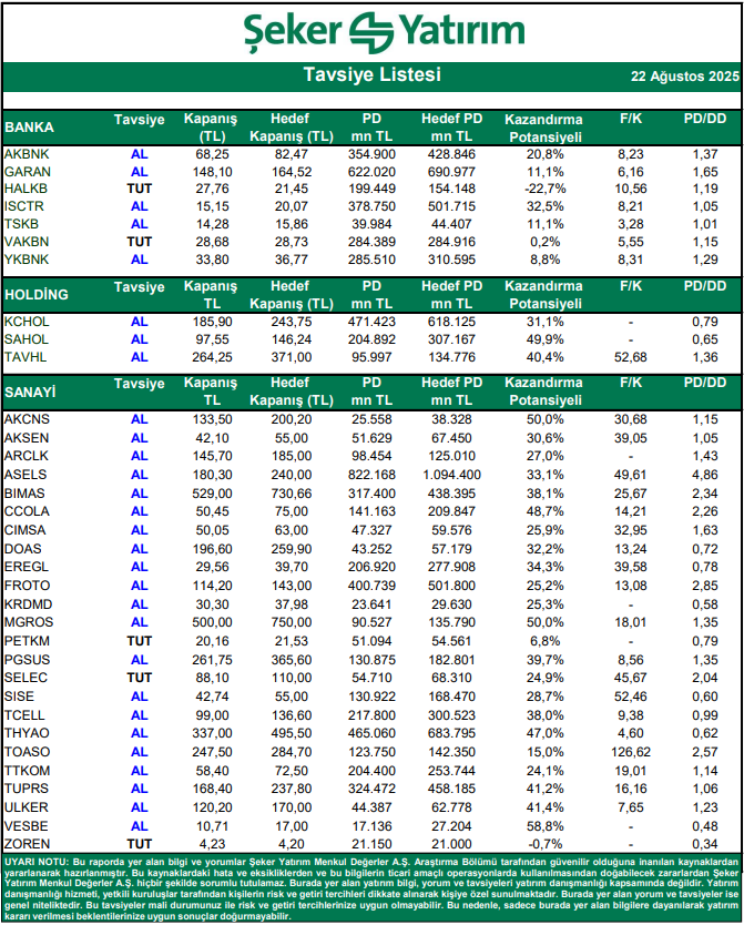 Kaynak: Şeker Yatırım Tavsiye Listesi
