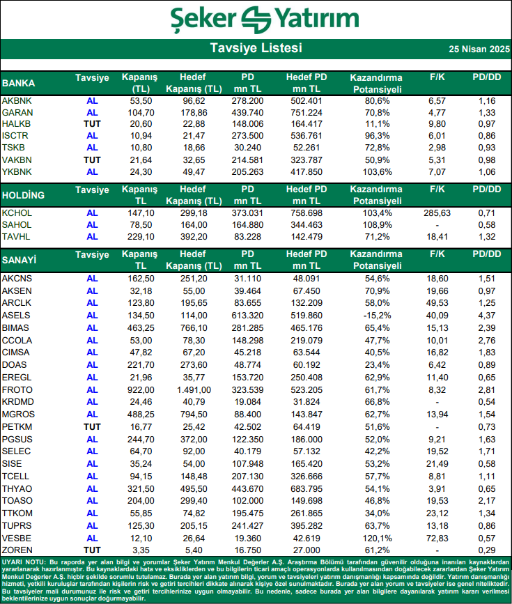 Şeker Yatırım Hisse Tavsiye Listesi – (25.04.2025)