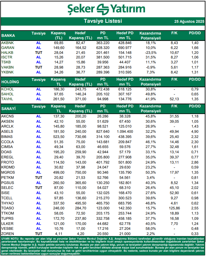 Şeker Yatırım Hisse Tavsiye Listesi – (25.08.2025)