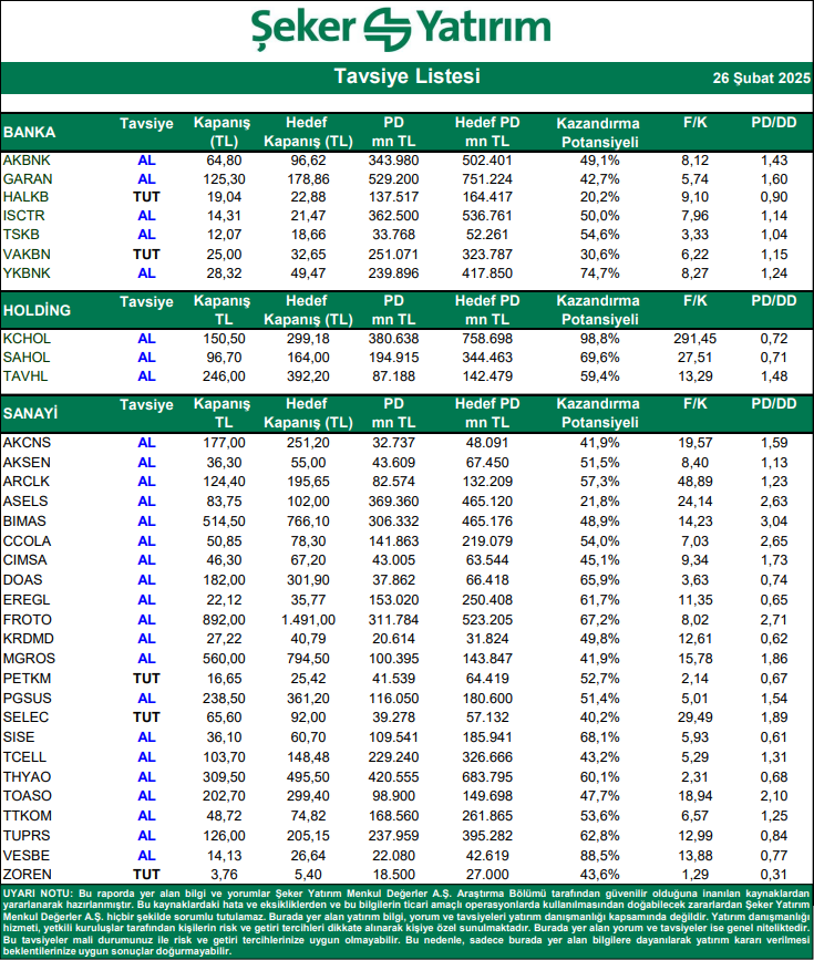 Şeker Yatırım Hisse Tavsiye Listesi – (26.02.2025)