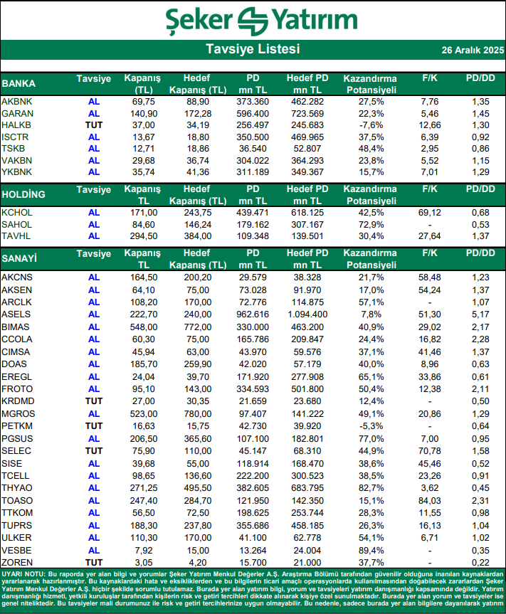 Kaynak: Şeker Yatırım Tavsiye Listesi