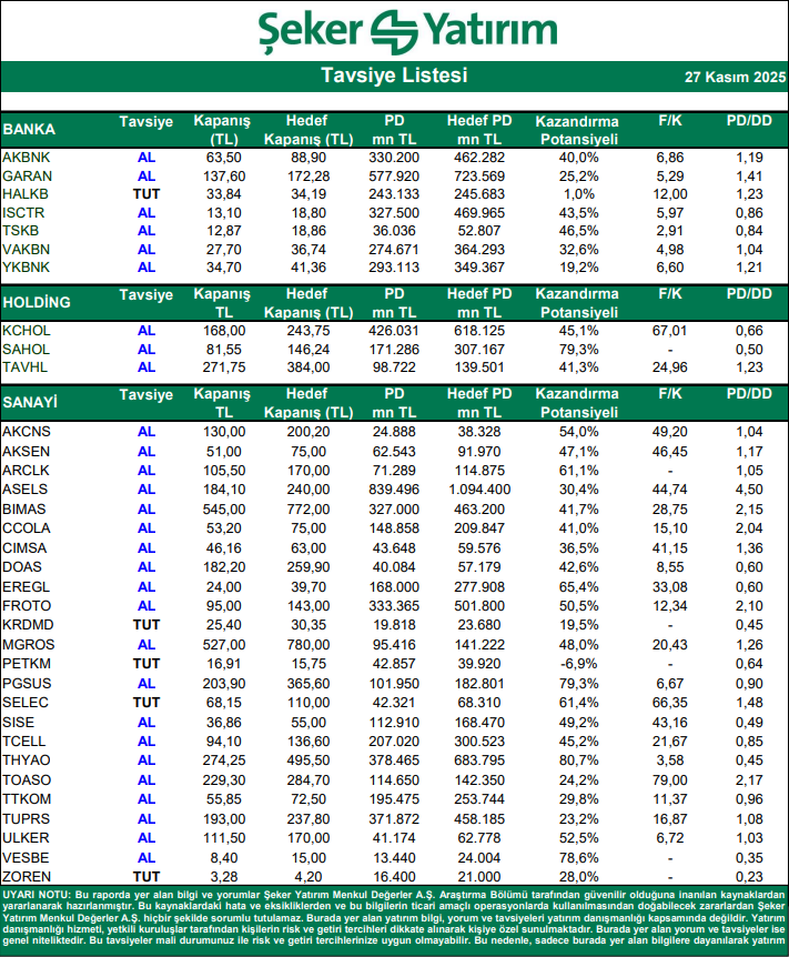 Şeker Yatırım Hisse Tavsiye Listesi – (27.11.2025)