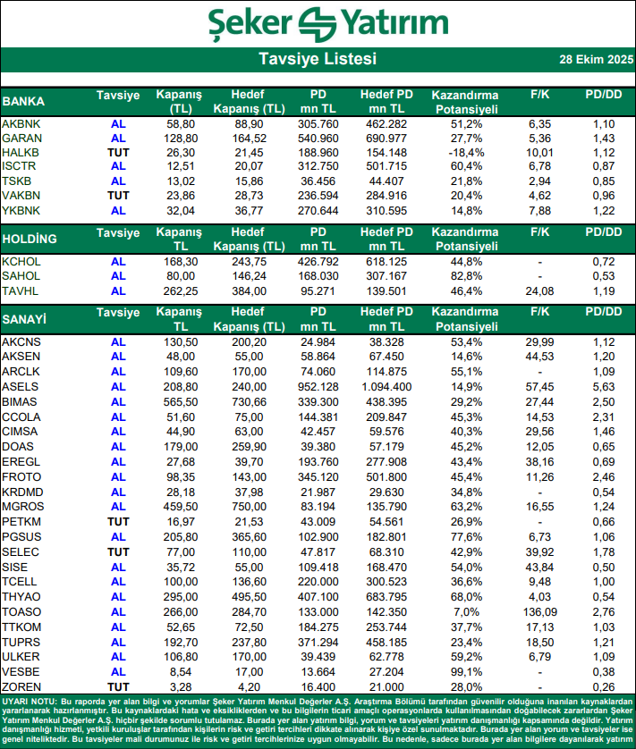 Kaynak: Şeker Yatırım Tavsiye Listesi
