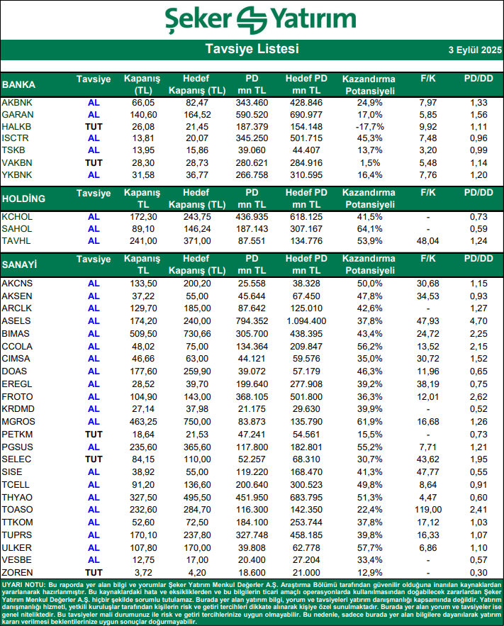 Kaynak: Şeker Yatırım Tavsiye Listesi