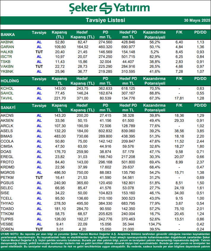 Kaynak: Şeker Yatırım Tavsiye Listesi