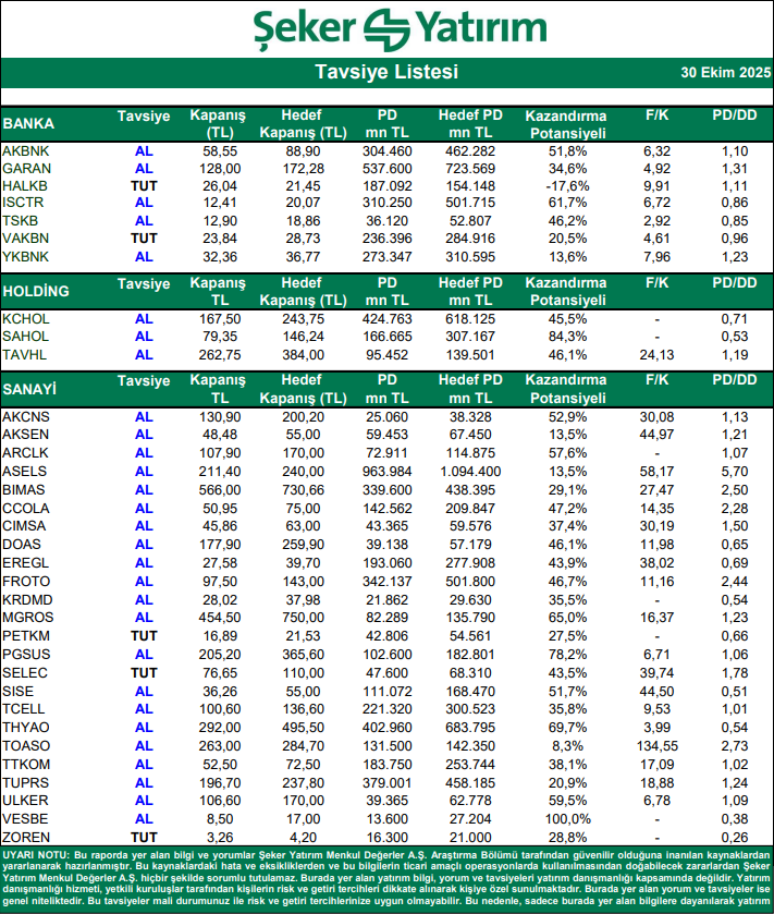 Kaynak: Şeker Yatırım Tavsiye Listesi