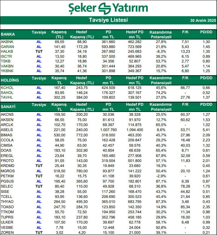 Şeker Yatırım Hisse Tavsiye Listesi – (30.12.2025)