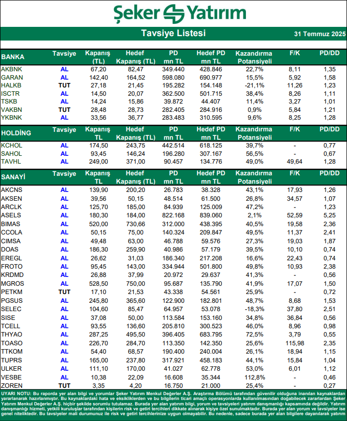 Şeker Yatırım Hisse Tavsiye Listesi – (31.07.2025)