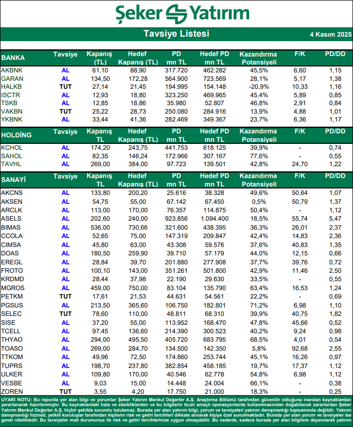 Kaynak: Şeker Yatırım Tavsiye Listesi