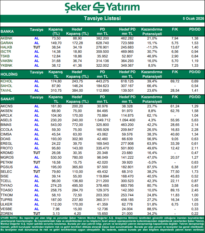 Kaynak: Şeker Yatırım Tavsiye Listesi