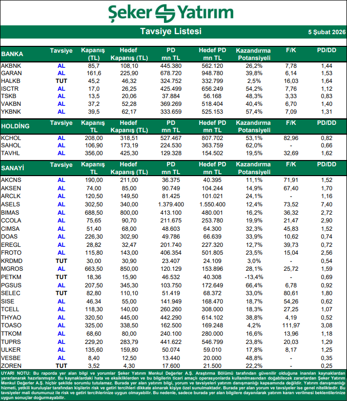 Şeker Yatırım Hisse Tavsiye Listesi – (5.02.2026)
