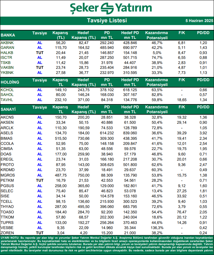 Kaynak: Şeker Yatırım Tavsiye Listesi