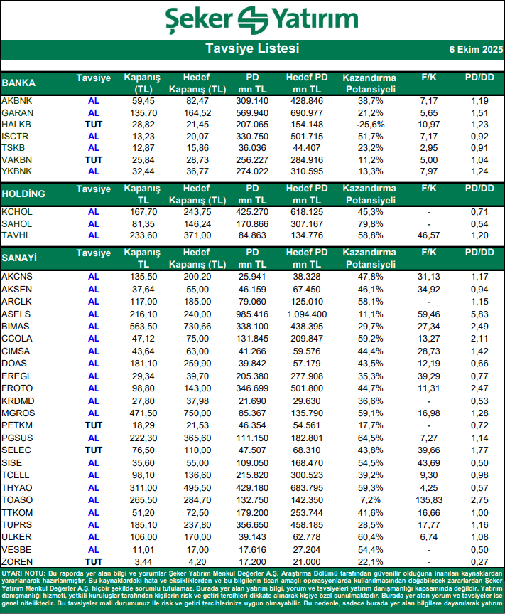 Kaynak: Şeker Yatırım Tavsiye Listesi