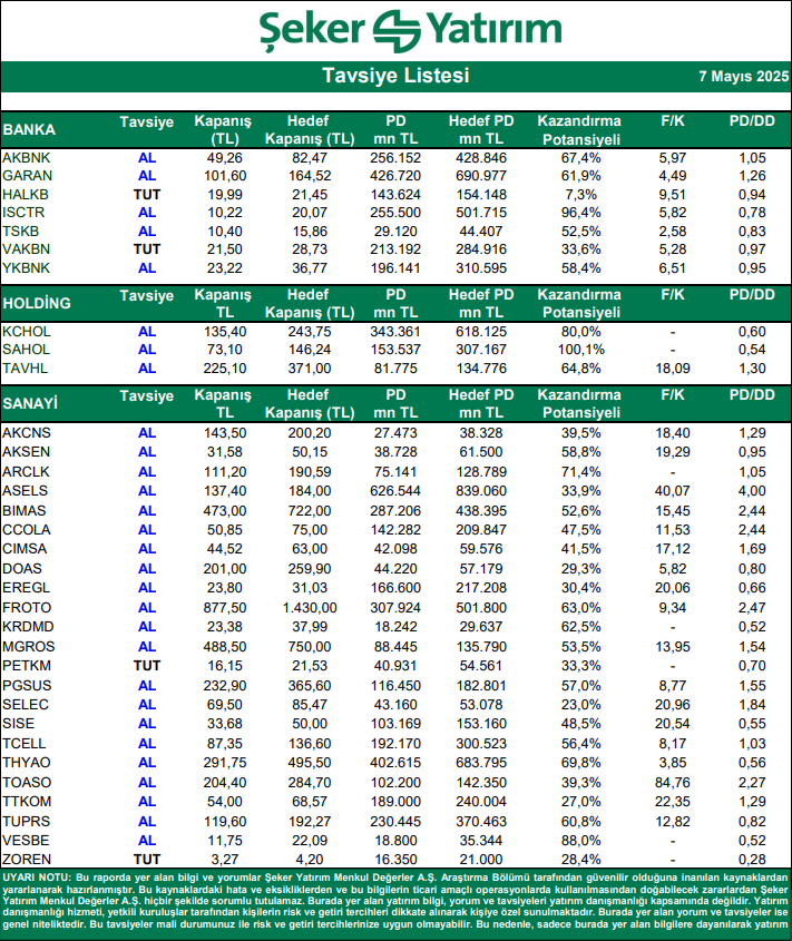 Kaynak: Şeker Yatırım Tavsiye Listesi