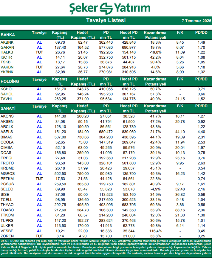 Kaynak: Şeker Yatırım Tavsiye Listesi