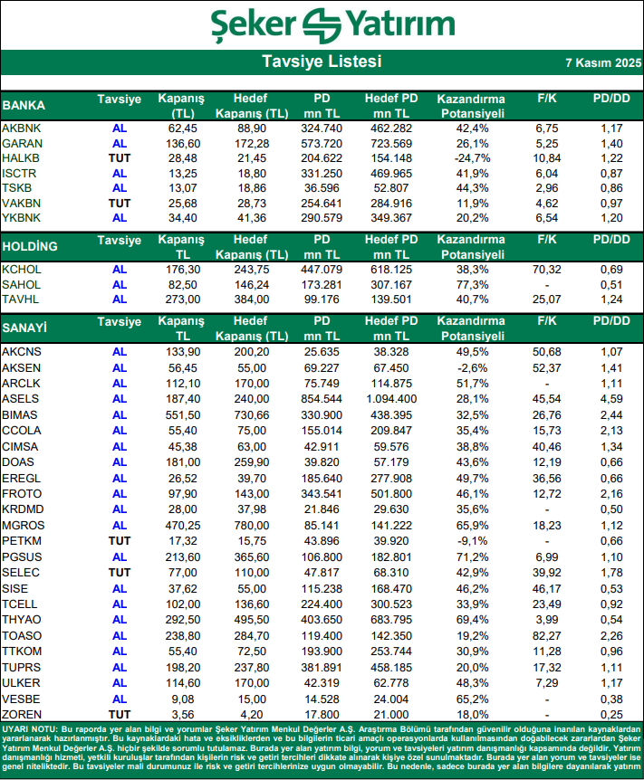 Şeker Yatırım Hisse Tavsiye Listesi – (7.11.2025)